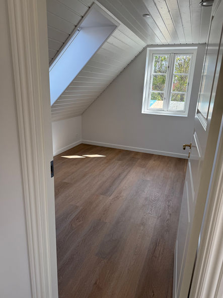 Her har jeg lagt nyt gulv med fokus på et ensartet udtryk og en flot afslutning. Gulvet er tilpasset rummenes vinkler og detaljer, så helheden spiller sammen med lofter, døre og vinduer. Resultatet er et lyst og indbydende rum med et slidstærkt gulv, der både fungerer i hverdagen og ser godt ud i mange år frem.